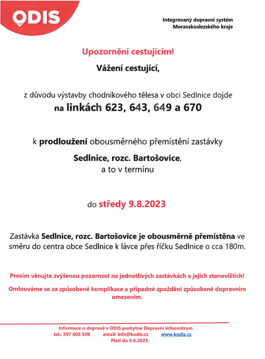 upozorňujeme na prodloužení přemístění zastávky Sedlnice, rozc. Bartošovice a to do středy 9.8.2023.
